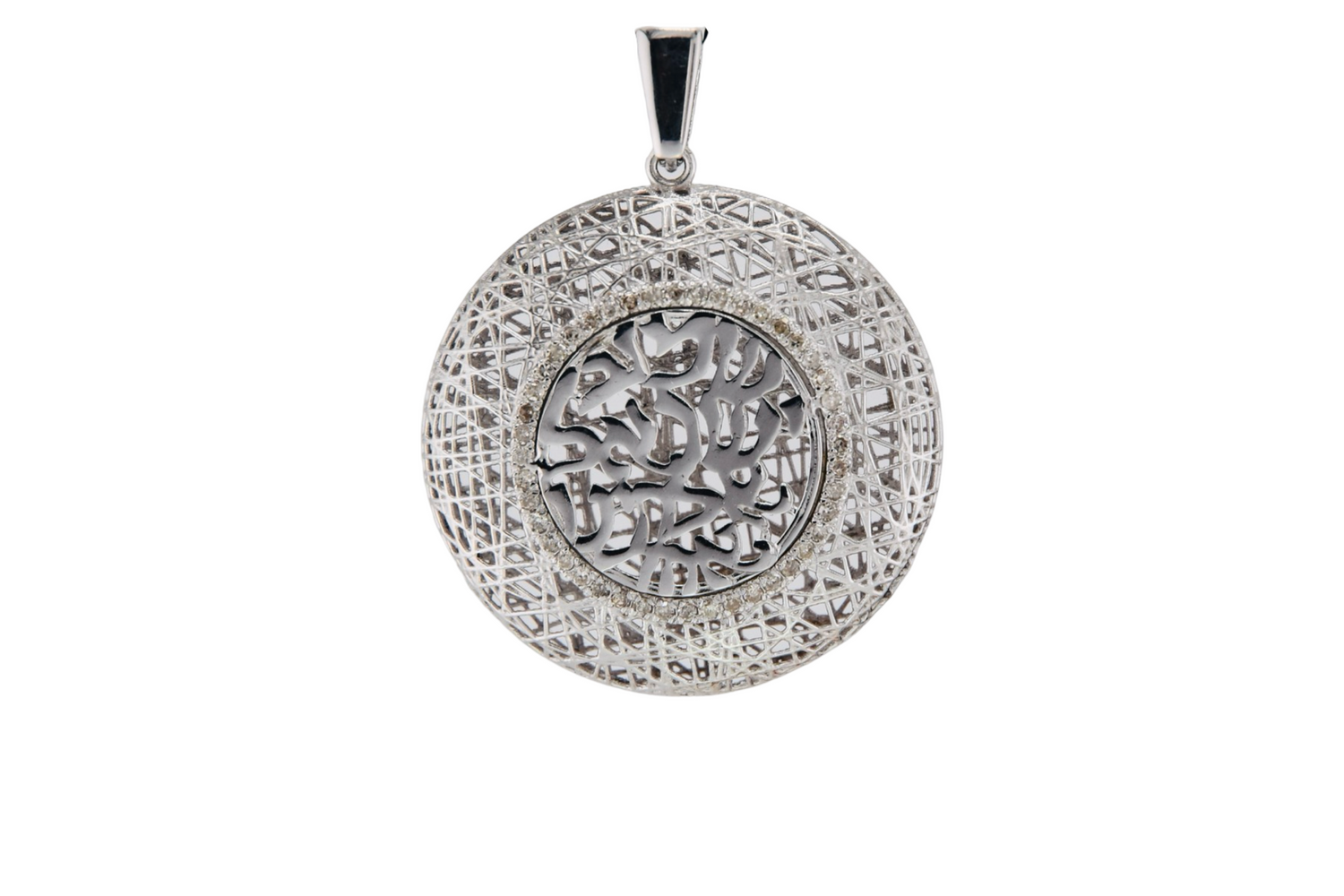 Design: Circular pendant with Shema Yisrael prayer in the center and a sparkling diamond halo