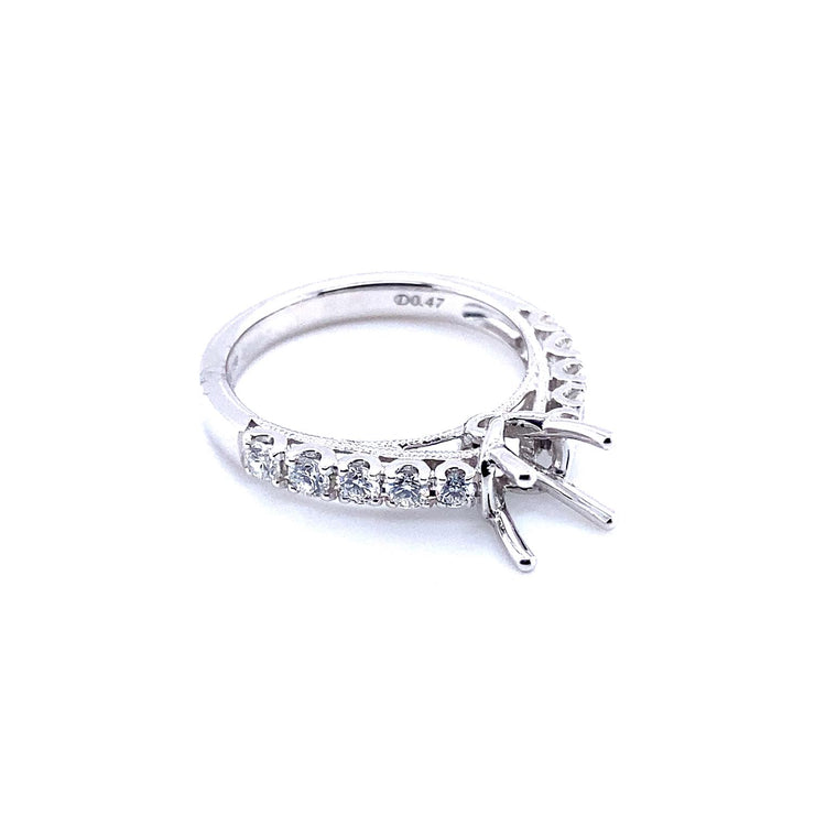 Celebrate the beauty of your love story with this exquisite 18K white gold semi-mount diamond ring, designed to symbolize your endless commitment. This ring features a diamond-studded shank that elegantly ascends to a V-shaped white gold halo, creating a striking frame for the centerpiece. At its heart lies a 4-prong setting, awaiting a classic round diamond to complete this timeless design.