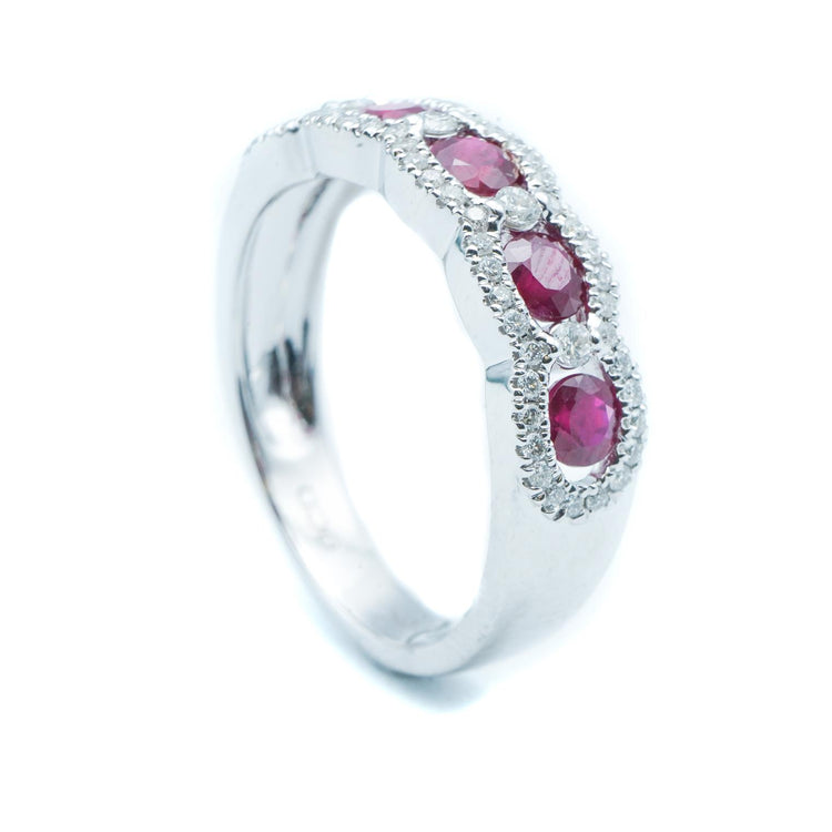 Design: Alternating ruby and diamond settings with halo accents for enhanced brilliance