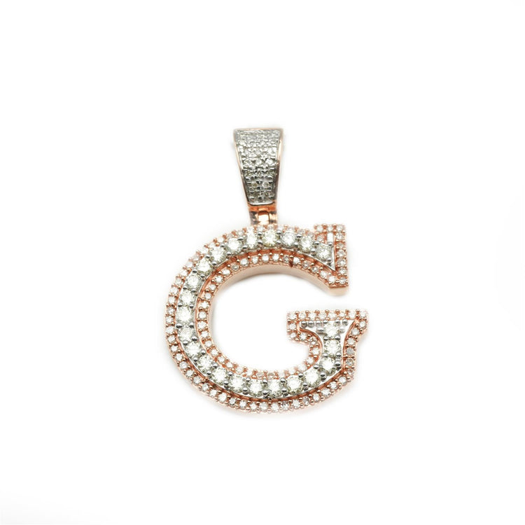 This 14K two-tone diamond "G" pendant is a masterful combination of yellow and rose gold, adorned with 1.02ct of round-cut diamonds graded H color and SI1 clarity. The diamonds are meticulously set in a micro-pavé style, ensuring an elegant and uniform sparkle. The design features a bold "G" shape, where the diamonds are carefully arranged along the curves and edges of the letter, creating a striking visual appeal. The rose gold base provides a warm, rich tone that beautifully contrasts with the brilliance of the diamonds, while the yellow gold bale adds an additional layer of sophistication.