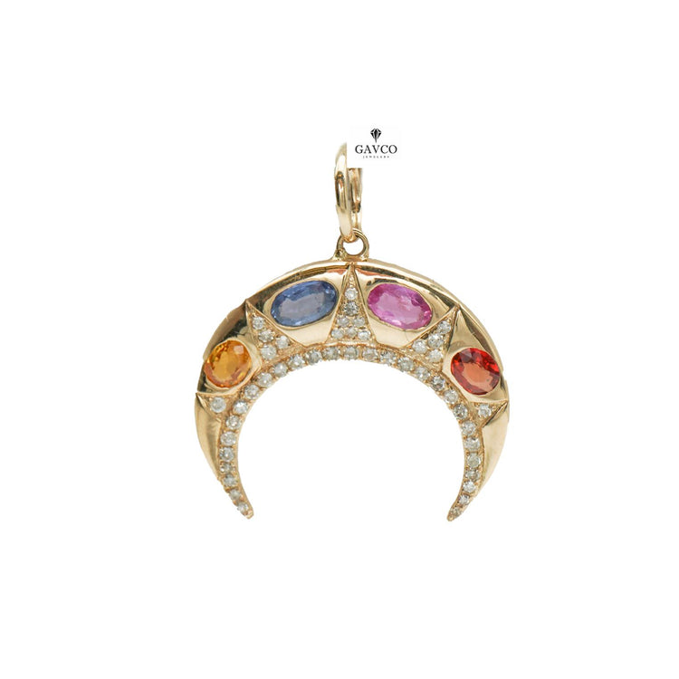 This enchanting 14K yellow gold crescent moon pendant features a captivating design adorned with four vibrant multi-colored gemstones. Surrounding the gemstones are 0.35ct of sparkling diamond accents in a micro pavé setting, creating a radiant and elegant piece. The diamonds, with G color and VS2 clarity, beautifully enhance the crescent moon's celestial charm, making this pendant a perfect blend of bold color and subtle sophistication. Ideal for adding a touch of magic to your jewelry collection or as a meaningful gift.