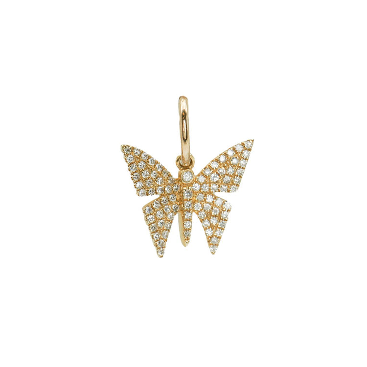 This captivating 14K yellow gold butterfly pendant showcases a dazzling display of 0.25ct round-cut diamonds in a meticulous micro-pavé setting. The glittering diamonds flood the gold butterfly design, creating a stunning balance of brilliance and elegance. With G color and VS2 clarity, this pendant offers exceptional sparkle and craftsmanship. Perfect for adding a whimsical yet sophisticated touch to any jewelry collection, this butterfly pendant is a timeless symbol of transformation and beauty.