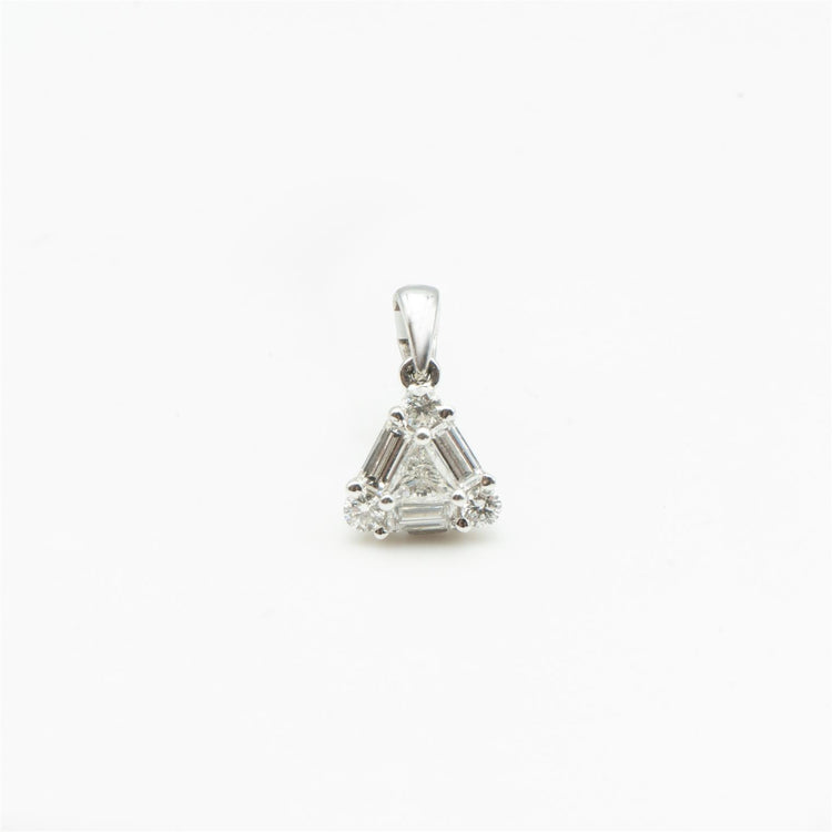 This 18K white gold triangle diamond cluster pendant is a strikingly elegant piece that showcases a trilliant diamond at its center, beautifully complemented by baguette and round diamonds arranged in a radiant triangular design. The diamonds are expertly set in a shared prong setting to maximize their brilliance and create a seamless, cohesive look. With a total diamond weight of 0.60ct, G color, and VS2 clarity, this pendant is a dazzling representation of contemporary sophistication and timeless beauty.