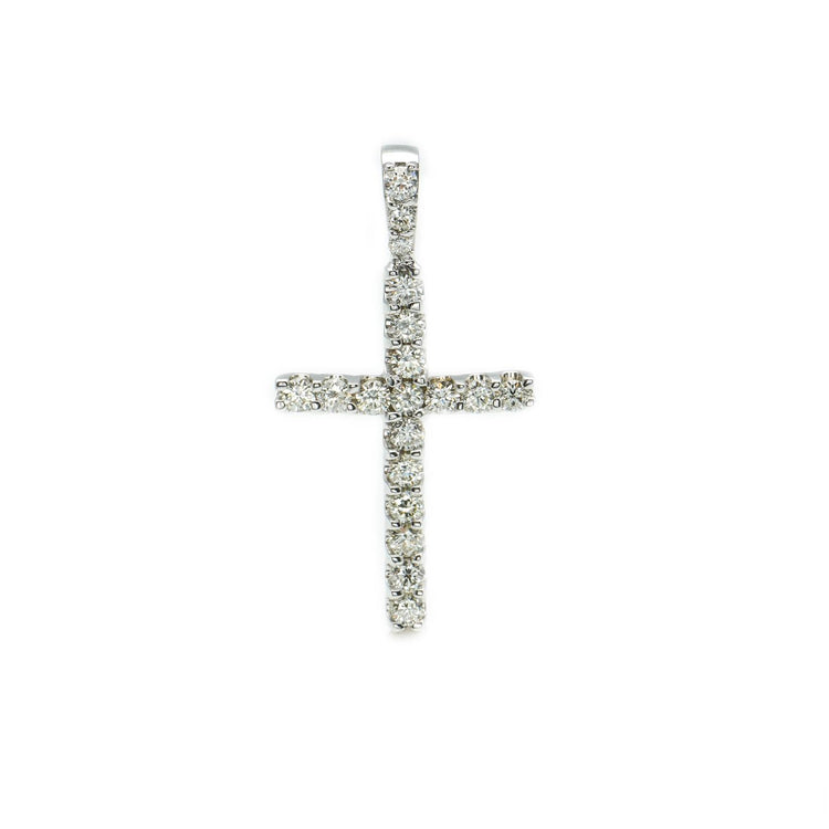 Elevate your style with this timeless 14K white gold medium diamond cross pendant. Crafted with 1.20ct of exquisite round diamonds, this pendant exudes brilliance and sophistication. The G color and VS2 clarity diamonds are carefully set in a micro pave design, creating a seamless and radiant sparkle.