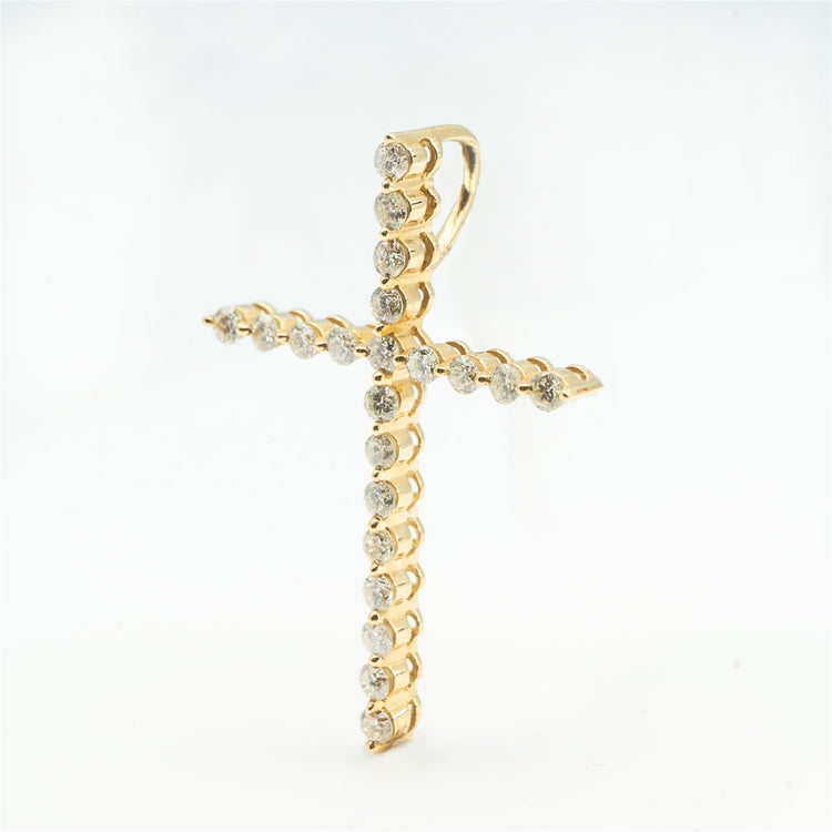 Gracefully designed, this 14K yellow gold thin diamond cross pendant radiates elegance and faith. Featuring 0.85ct of round-cut diamonds in a dazzling G color and VS2 clarity, each diamond is meticulously set to create a sleek and timeless piece. The minimalistic design emphasizes the brilliance of the diamonds, making it perfect for both everyday wear and special occasions.