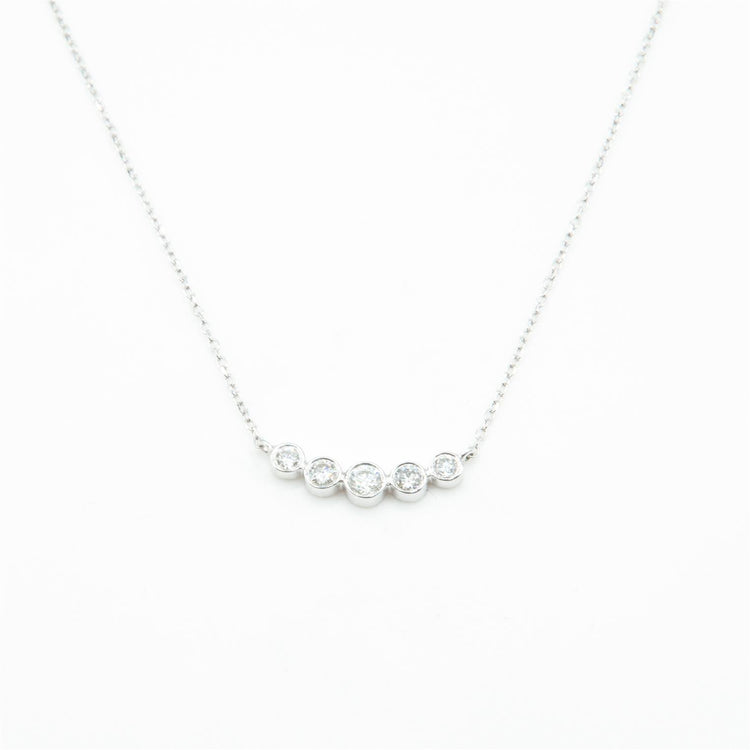 A graceful blend of elegance and simplicity, this 14K white gold necklace features a stunning graduated bezel-set diamond pendant. The pendant showcases five round-cut diamonds arranged in a delicate curve, embodying balance and sophistication. With a total diamond weight of approximately 0.25ct, each diamond is carefully selected for its G color and VS2 clarity, ensuring exceptional brilliance.