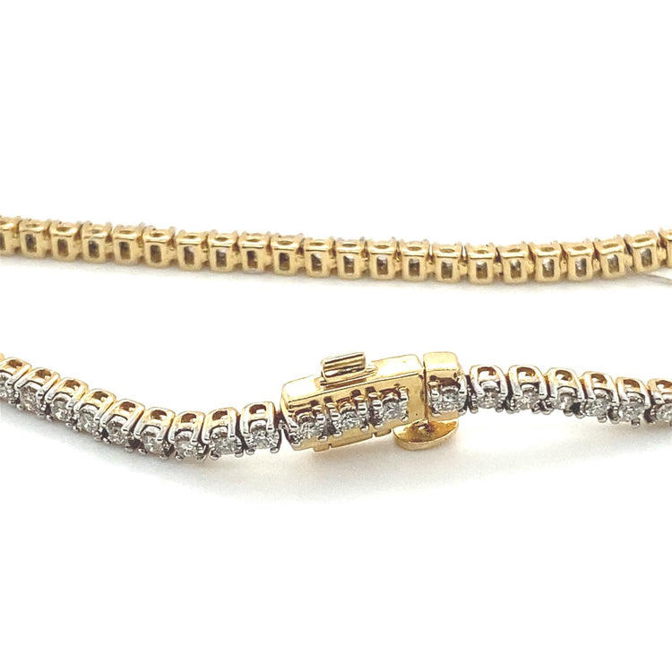 This 14K yellow gold diamond tennis bracelet exudes timeless elegance and sophistication. Featuring 1.20 carats of brilliant round diamonds, each meticulously secured in a shared prong setup, this bracelet dazzles with unparalleled brilliance. The diamonds boast G color and VS2 clarity, ensuring exceptional sparkle and quality.