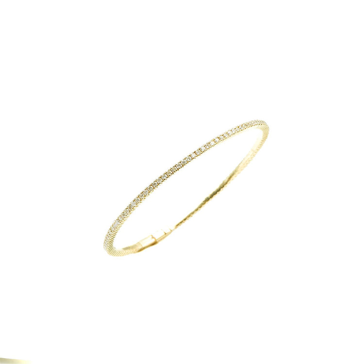 b Enhance your jewelry collection with this stunning 14K yellow gold flexible bangle, featuring 1.90 carats of round-cut diamonds. Each diamond is securely held in a shared prong setting, creating an unbroken circle of brilliance and elegance.