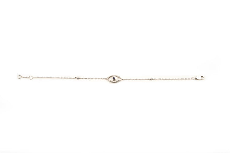 Crafted in 14K white gold offering an endless shine, the radiance of this exquisite bracelet comes from the shimmer and sparkle of the round cut Diamonds on it. Showcasing a fascinating sapphire eye design, this breathtaking jewelry is sure to keep you in the spotlight everywhere you go!