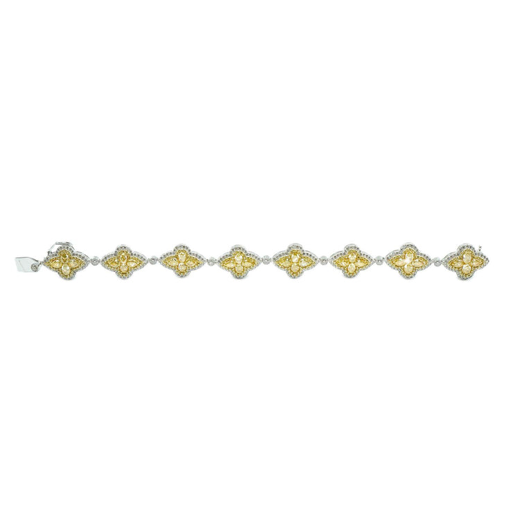 This exquisite Yellow Diamond Flower Tennis Bracelet is a captivating masterpiece that celebrates elegance and artistry. Each floral motif is crafted with a combination of oval and pear-shaped yellow diamonds arranged in a stunning shared prong setting to form vibrant petals. Encircling each flower are round-cut yellow and white diamonds, meticulously set in a micro pavé design, creating a radiant and dimensional effect.