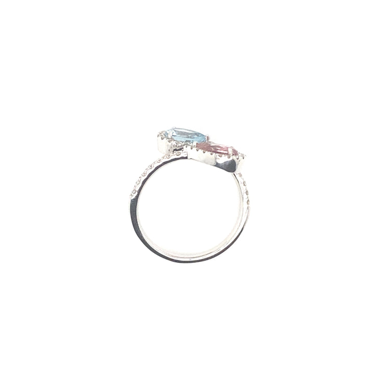 This stunning 14K white gold bypass ring exudes elegance and sophistication. Featuring two exquisite pear-shaped tourmalines, with a combined weight of 1.25 carats, the ring showcases a harmonious blend of vibrant hues. The bypass design is adorned with 0.50 carats of sparkling diamonds, meticulously set in a shared prong setting, enhancing the brilliance of the tourmalines. With G/H color and VS1 clarity, the diamonds add a dazzling touch to this unique and timeless design.