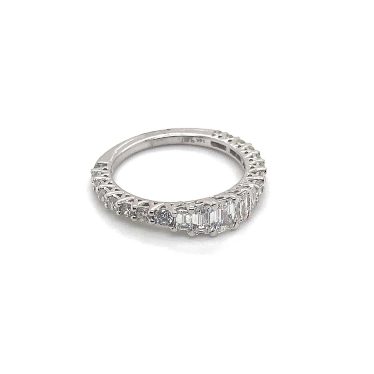 This exquisite 14K white gold diamond ring showcases a breathtaking combination of round and baguette-cut diamonds for a design that seamlessly blends classic and modern styles. The shank is adorned with meticulously set full round-cut diamonds, creating a trail of brilliance that leads to the focal point – a stunning array of graduated baguette diamonds at the center.