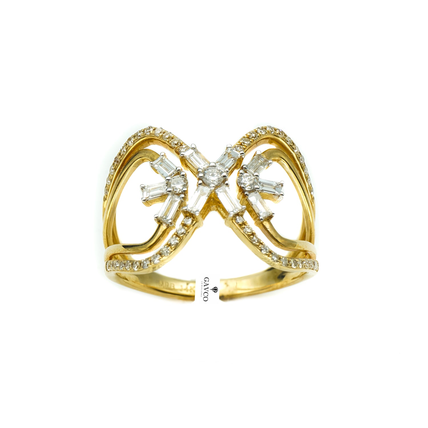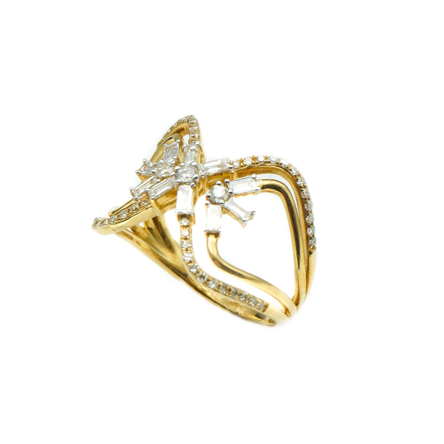 Bold and dazzling, the Starburst Statement Ring is a true masterpiece crafted in 14K yellow gold. This eye-catching design features a radiant starburst cluster of diamonds at its center, with a combination of baguette and round-cut stones totaling 0.68ct. The sparkling diamonds, graded G color and VS2 clarity, are beautifully arranged along intersecting, open gold bands, creating a dynamic and sophisticated look.