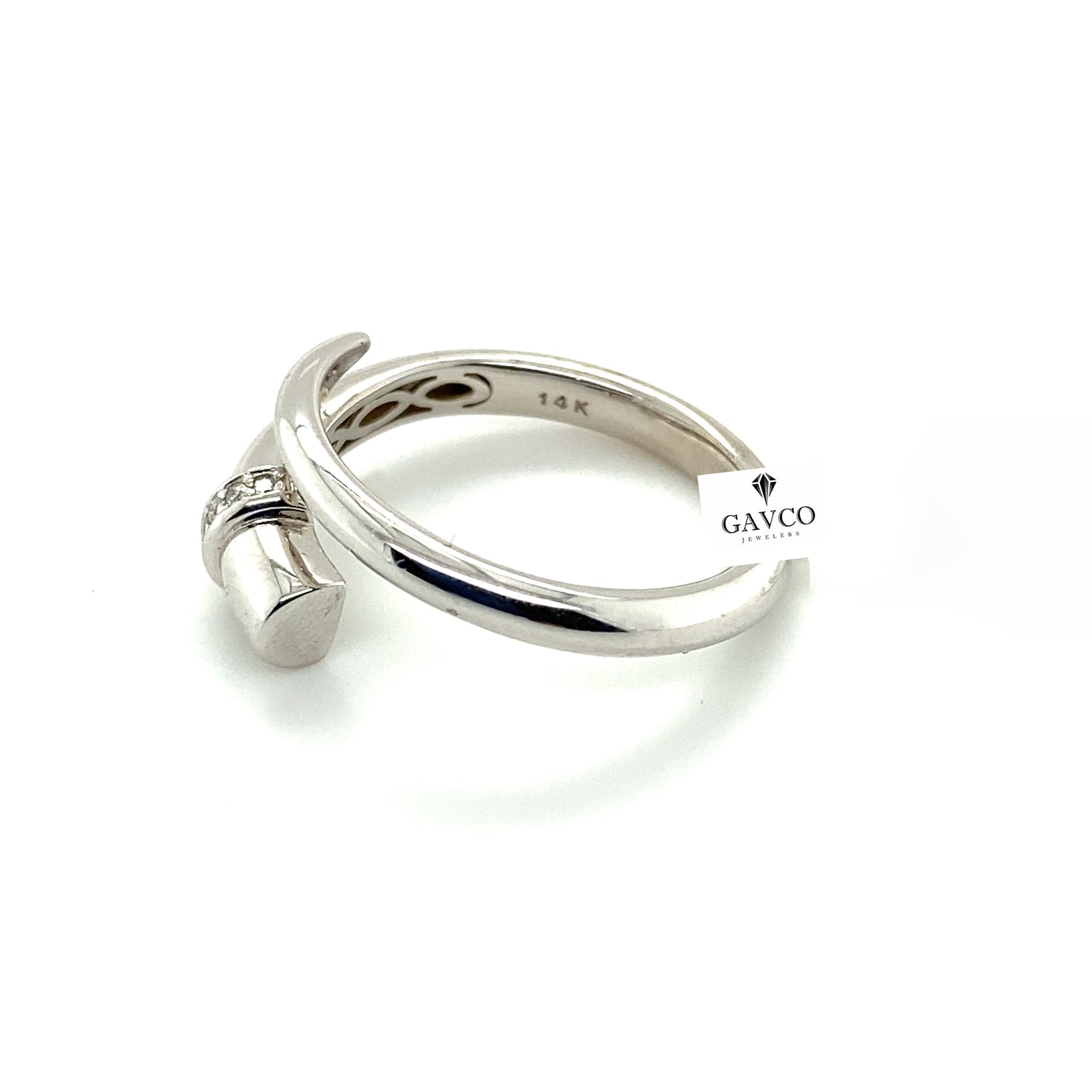 Sleek and modern, this 14K white gold nail ring redefines contemporary elegance. Inspired by industrial design, the ring wraps gracefully around the finger in the shape of a polished nail, creating a bold yet sophisticated look. The head of the nail is adorned with 0.08ct of sparkling diamonds, featuring F/G color and VS2 clarity, adding a touch of brilliance to this edgy design.