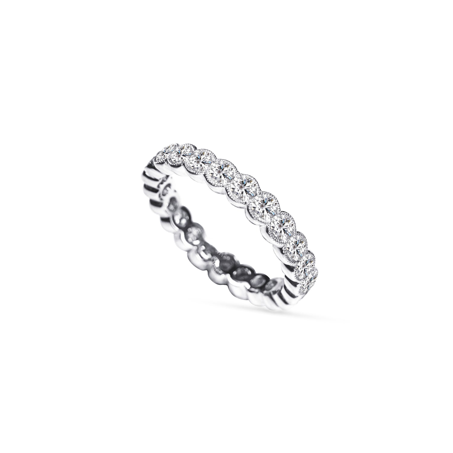 The unique scalloped design of this band enhances the brilliance of each diamond, ensuring maximum light reflection for an unmatched radiance. Crafted in sleek white gold, this piece is perfect for stacking, pairing with an engagement ring, or wearing as a statement band on its own.