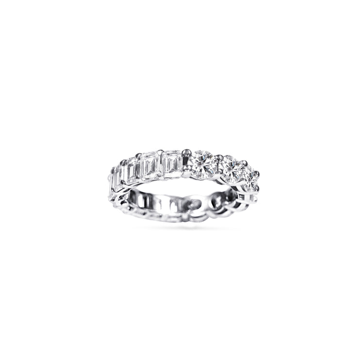 A true statement of elegance and brilliance, this 14K white gold Eternity Ring showcases a stunning 6.05CT of G color, VS2 clarity lab-grown diamonds in a unique shared prong setting. This breathtaking piece features a harmonious blend of round and baguette-cut diamonds, delivering an exquisite contrast of brilliance and sophistication.