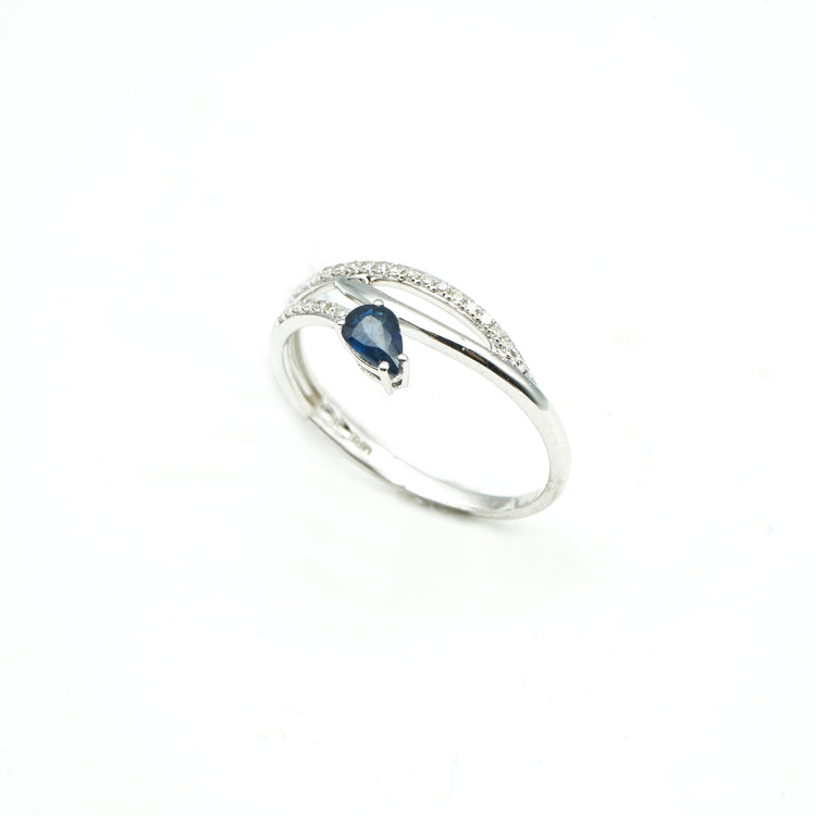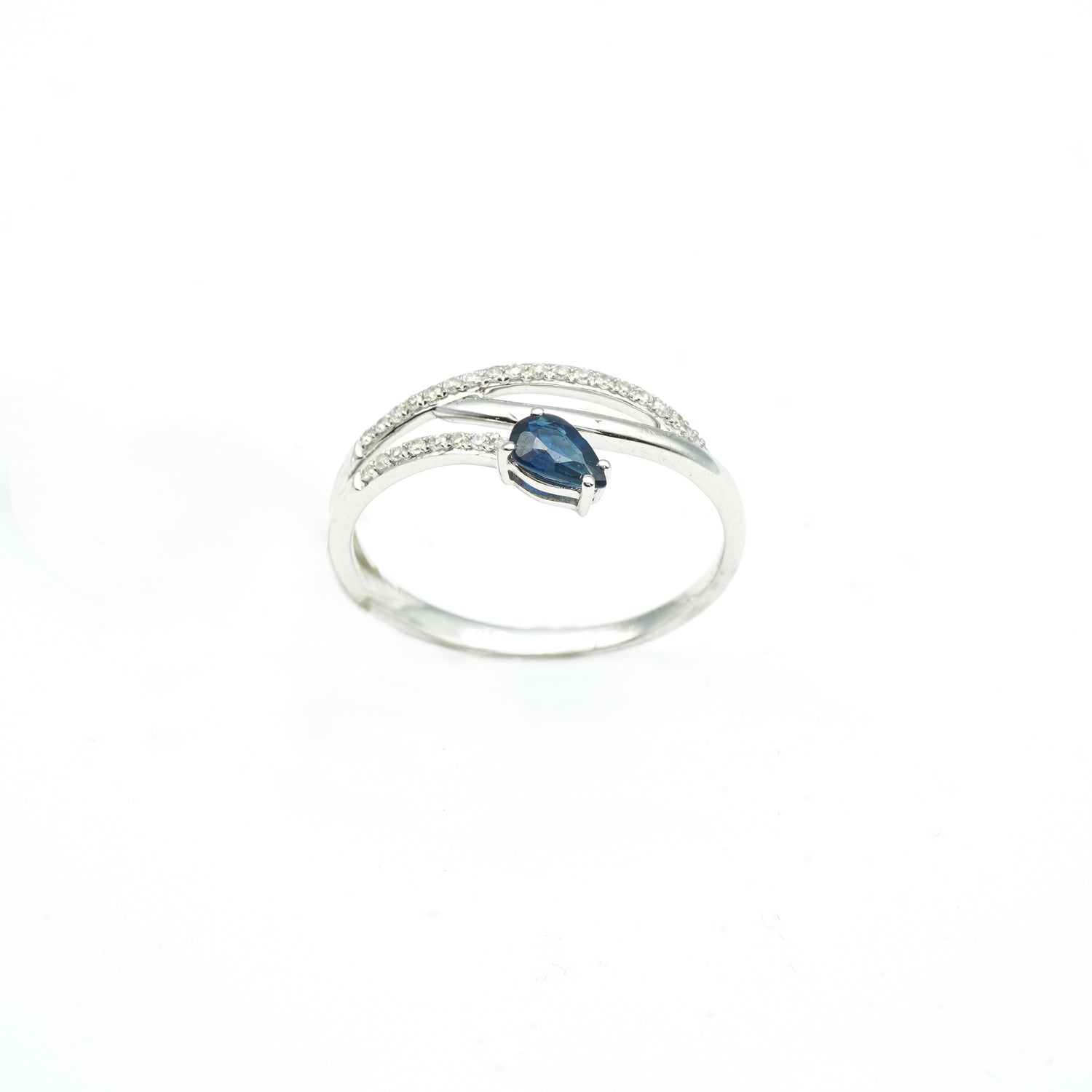 The Eternal Grace diamond ring is a harmonious blend of elegance and modern design. Crafted in 14K white gold, this exquisite piece features a stunning 0.11ct pear-shaped sapphire that glows with deep blue brilliance. Surrounding the sapphire are 0.28ct of sparkling diamonds, gracefully set along an intertwined band that adds movement and sophistication to the design.