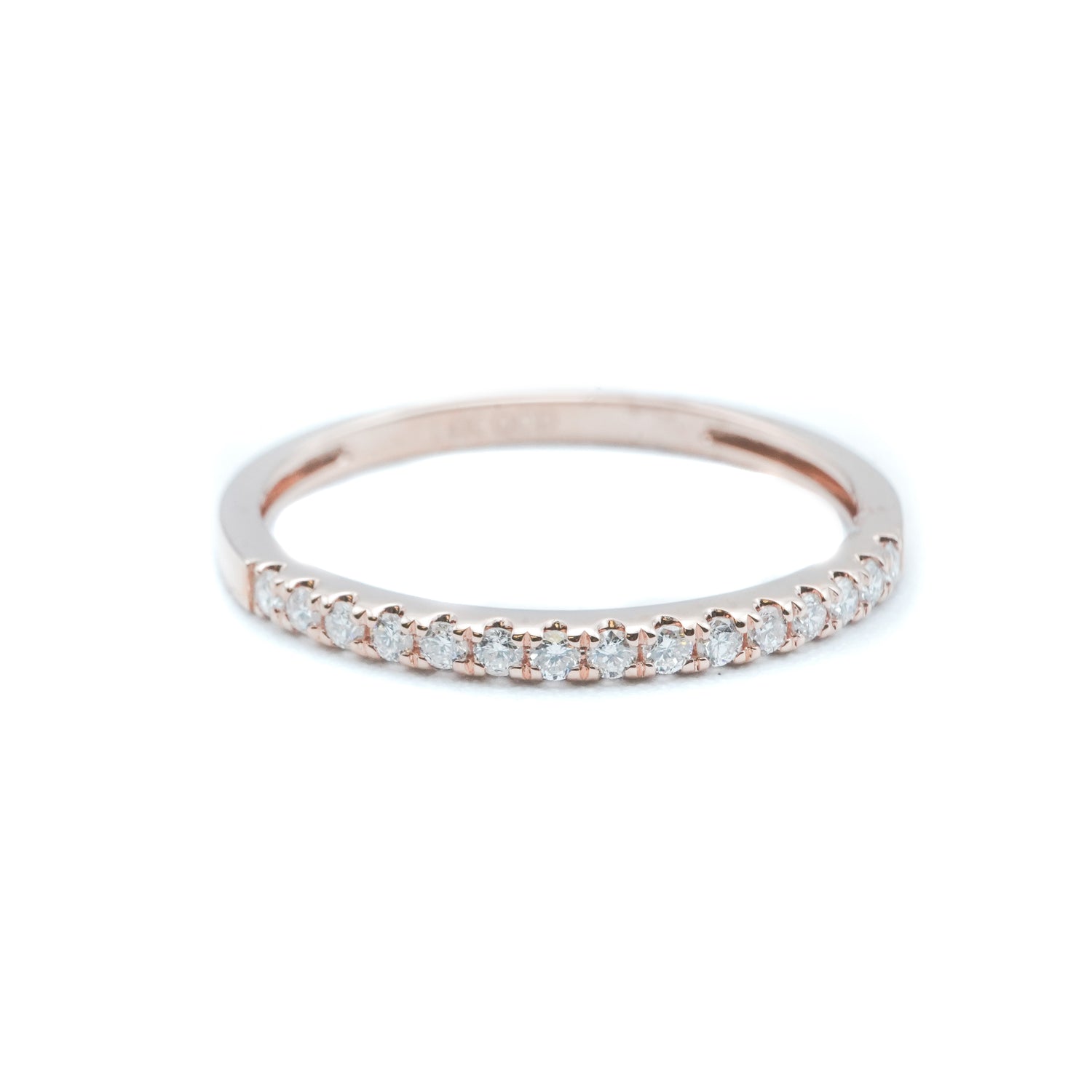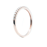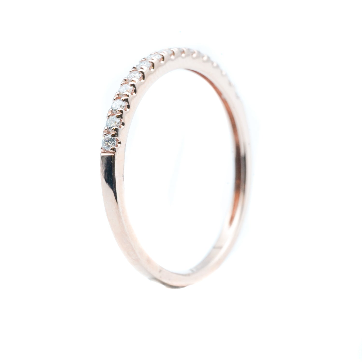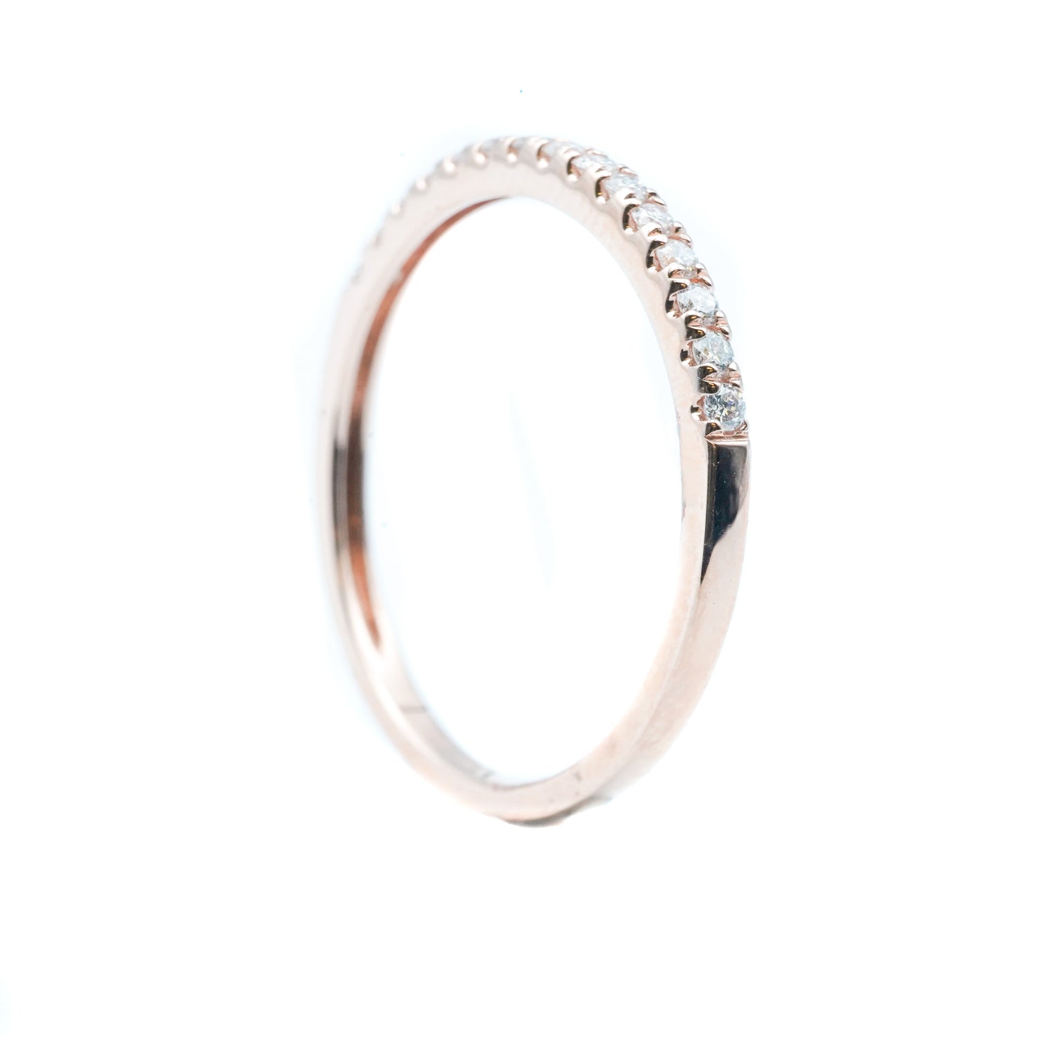 This 14K Rose Gold Wedding Band is the epitome of timeless elegance, designed to symbolize your enduring love. Featuring 0.20ct of dazzling round diamonds, each meticulously held in a secure 4-prong setting, this band radiates brilliance and sophistication. The diamonds are artfully arranged along the top half of the band, ensuring a stunning sparkle that catches the light with every movement.