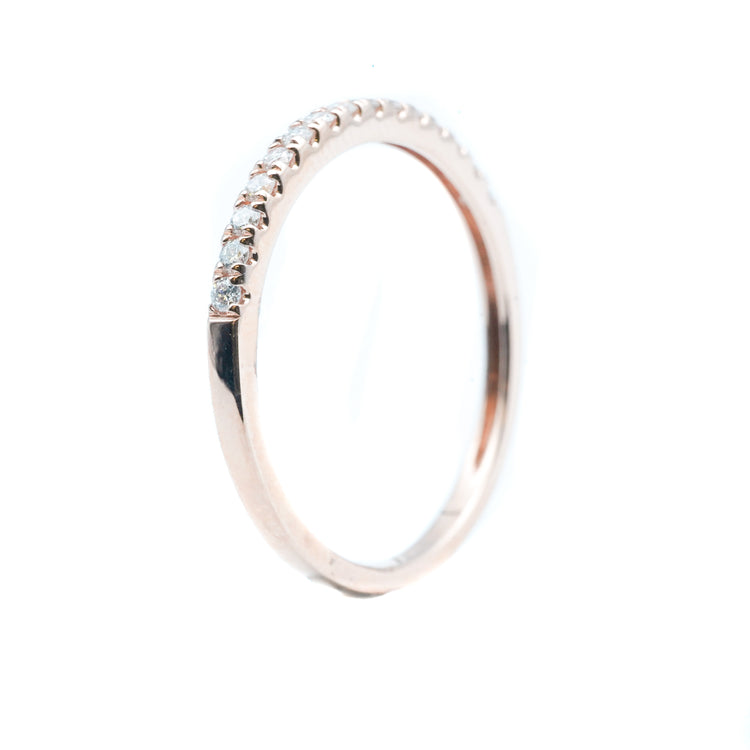 The warm hue of rose gold beautifully complements the diamonds, which are G color and VS1 clarity, offering unmatched brilliance and quality. Whether worn alone or paired with an engagement ring, this wedding band is a versatile and meaningful addition to your jewelry collection. Celebrate your love story with this exquisite piece that promises to shine as bright as your future together.